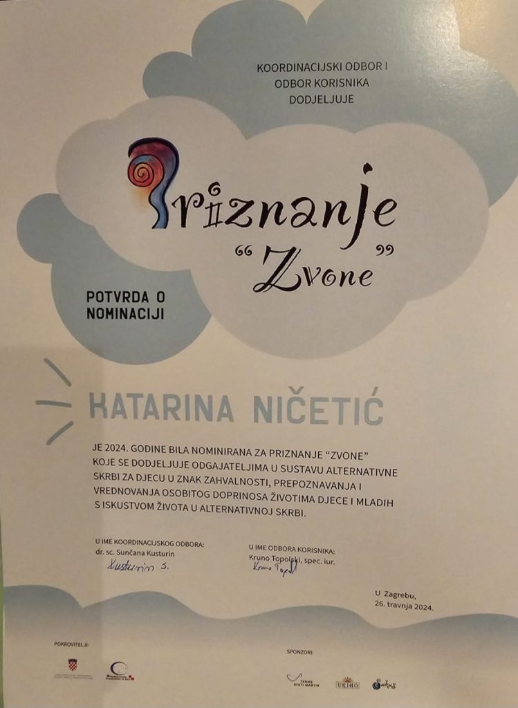 U Zagrebu 26. travnja 2024. održala se dodjela Priznanja “Zvone”, koje se dodjeljuje odgajateljima u sustavu skrbi za djecu u znak zahvalnosti, prepoznavanja i vrednovanja njihovog osobitog doprinosa životima djece i mladih s iskustvom života u alternativnoj skrbi.